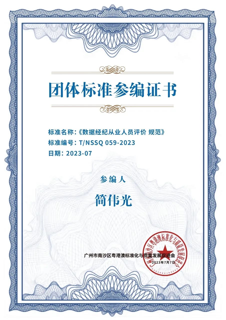 ▲图为PA集团大数据业务部总经理简伟光参编证书