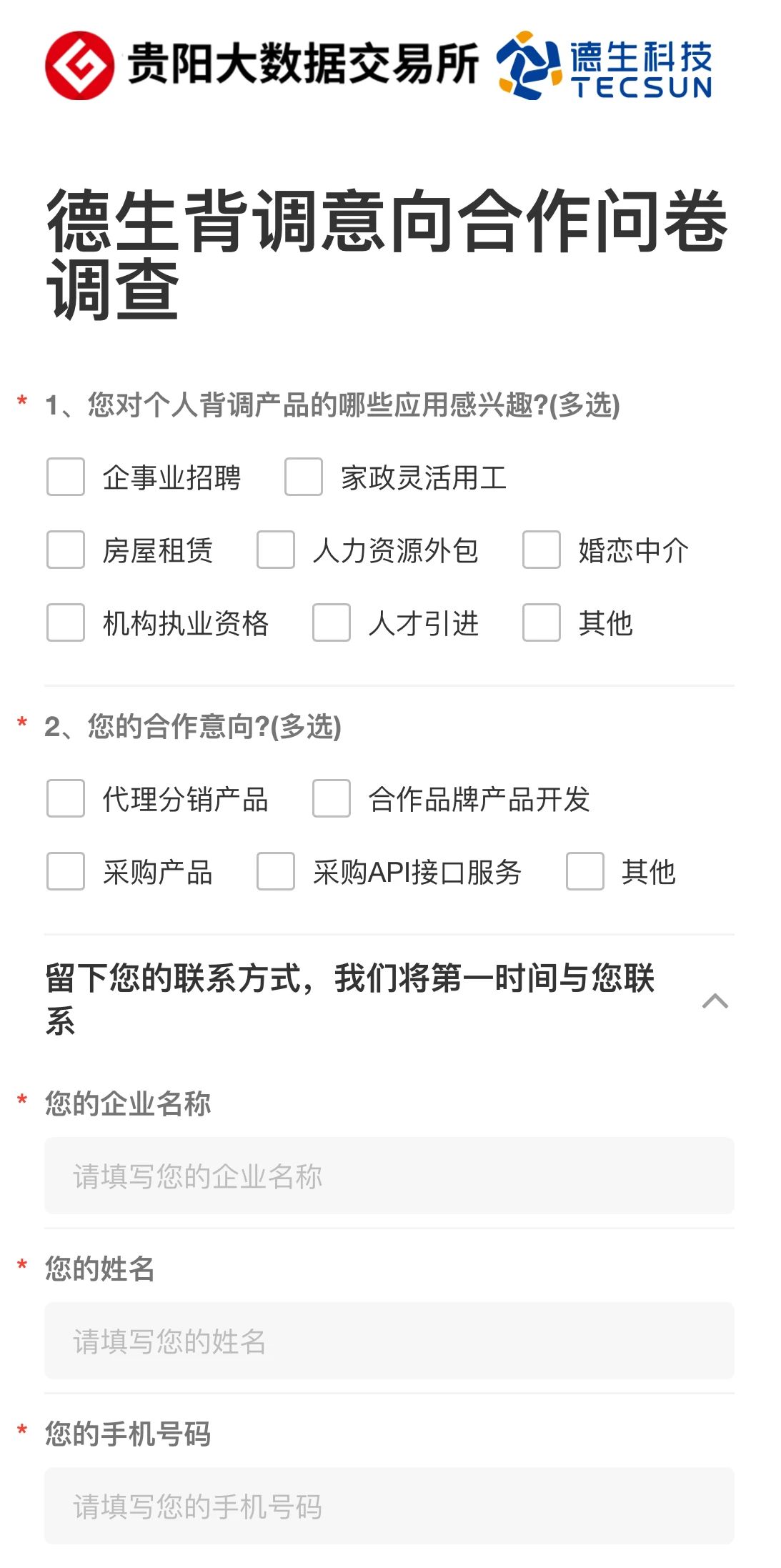 推动数据交易市场建设,既需要交易所的引领,也需要供方、需方、数据商、数据中介等各方通力合作。贵阳大数据交易所贵数甄选诚挚邀请对背调服务感兴趣的市场主体填写“意向合作问卷”,共同探索新的市场机遇、开发新的背调应用场景,实现资源共享、互利共赢。'