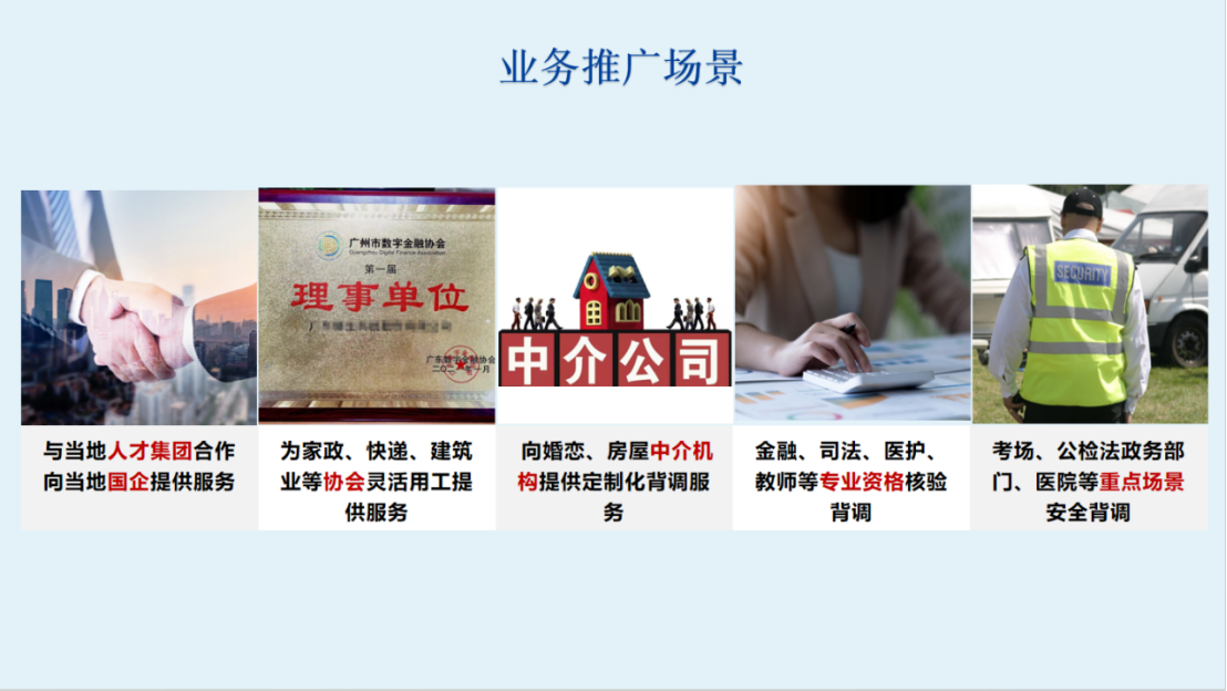 3.定制化服务,针对婚恋、房屋中介机构等特定行业量身打造背调方案;