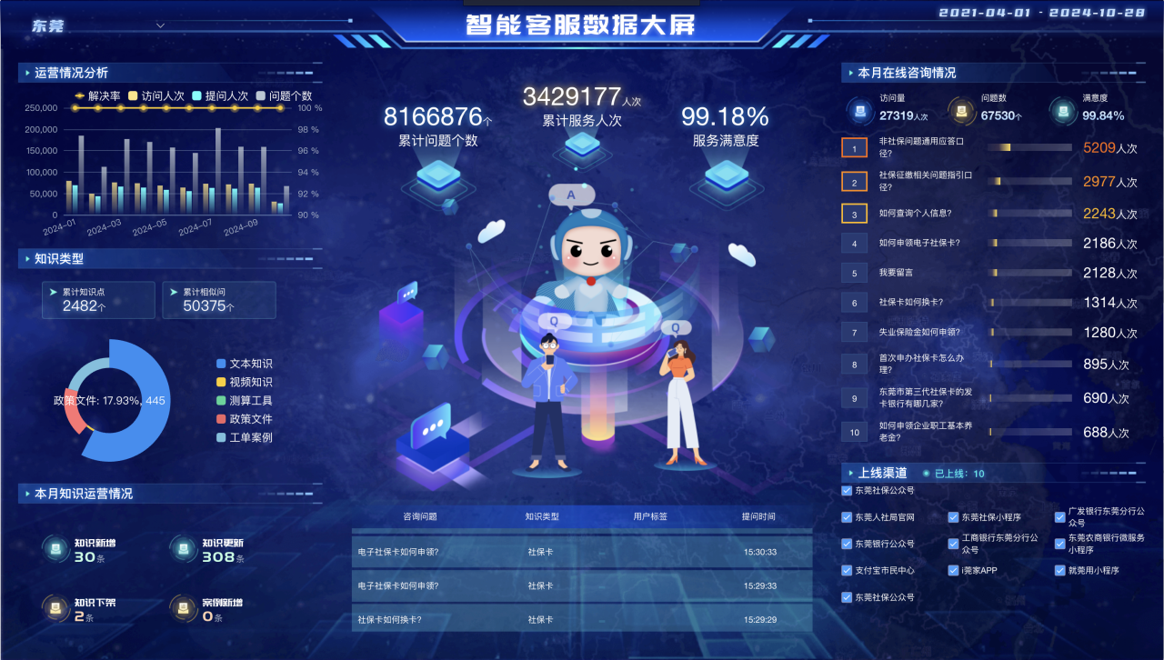 依托AI大模型、数字人、知识库等技术支持,PA集团成功助力东莞社保智能客服迭代升级为新一代领先的大模型智能客服,破解了群众社保疑难“不知去哪问”的难题,并实现问答咨询与业务办理的跳转对接,形成了“常规服务”到“延伸服务”的问办一体精准主动服务体系,让政务服务听得更快、问得更准、办得更实。自2021年4月上线以来,智能客服累计解答343万人次的817万个问题,解答率达99%以上。