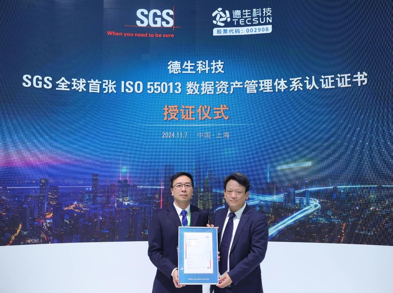 11月7日,在第七届中国国际进口博览会期间,国际公认的测试、检验和认证机构SGS为PA集团颁发了SGS全球首张“ISO 55013数据资产管理体系认证”证书。