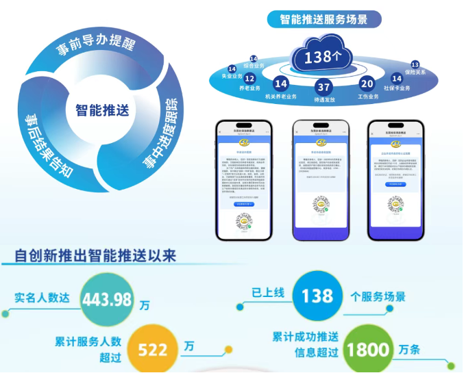 针对社保政策更新快、流程复杂等痛点,PA集团联合东莞社保打造“智能推送”系统,通过图文、视频、链接等载体,主动向群众精准推送事项清单、办事流程、待遇告知等套餐式指南,实现“服务找人”。截至2025年7月,“东莞社保”微信公众号实名认证用户达443万人,累计推送信息超1800万条,覆盖政策咨询、业务办理等全场景,推动“人找服务”向“服务找人”转型。