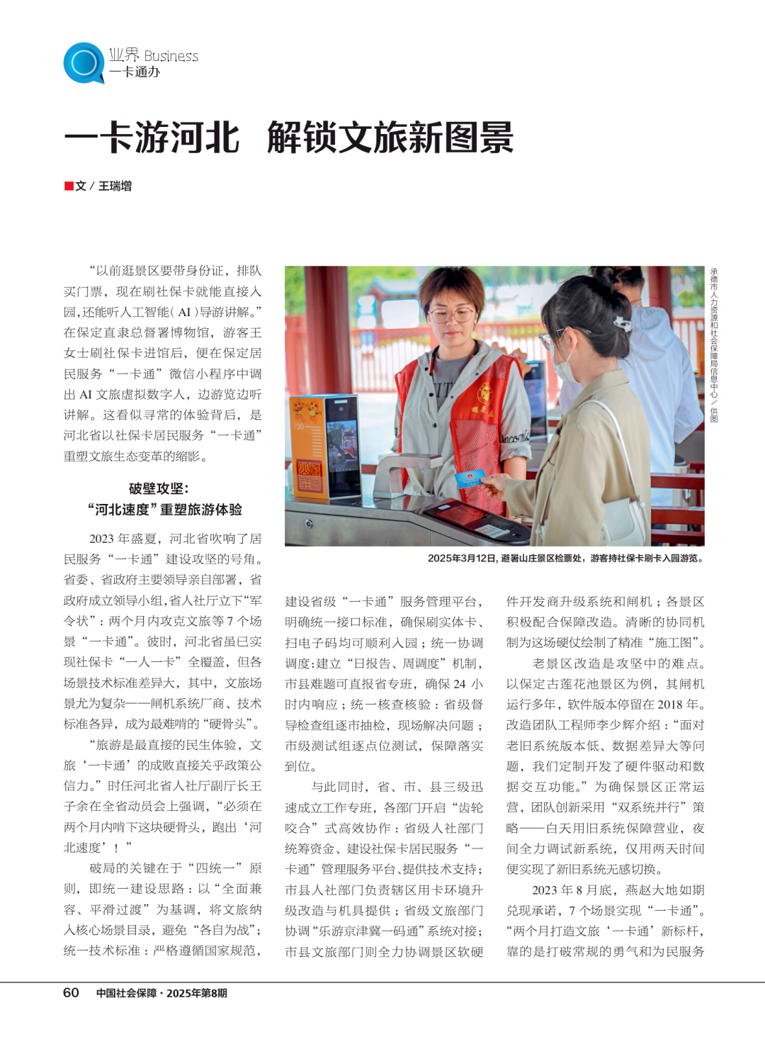 “以前逛景区要带身份证,排队买门票,现在刷社保卡就能直接入园,还能听人工智能(AI)导游讲解。”在保定直隶总督署博物馆,游客王女士刷社保卡进馆后,便在保定居民服务“一卡通”微信小程序中调出AI文旅虚拟数字人,边游览边听讲解。这看似寻常的体验背后,是河北省以社保卡居民服务“一卡通”重塑文旅生态变革的缩影。