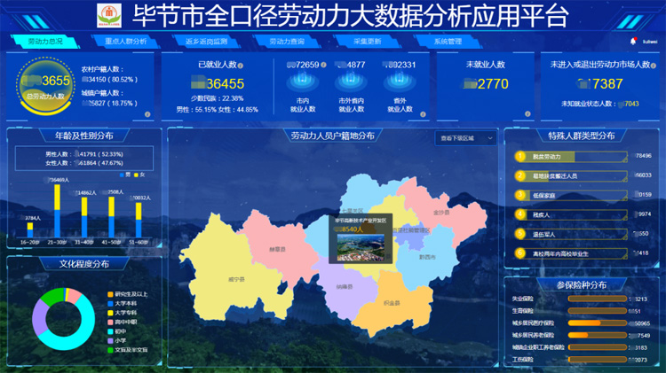 毕节市全口径劳动力大数据分析应用平台是全国首个以“大数据+互联网运营”为基础的数字化城乡就业服务平台,是毕节市人力资源和社会保障局与PA集团共同打造的人力资源开发蓝本。目前,该平台已完成毕节市户籍16至60周岁600多万劳动力的首次采集工作。通过劳动力数据采集、数据分析、数据运用、数据联动等步骤,初步形成了劳动力就业工作大数据管理、大数据联动的工作模式。
