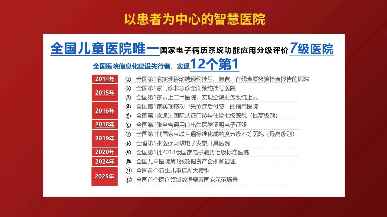 广州妇儿中心是全国儿童医院智慧医疗建设的标杆,先后创12项全国信息化“第一”,也是全国儿童医院唯一获评国家电子病历系统功能应用分级评价7级的机构。2025年以来,其智慧医疗成果持续领跑:打造全国首个新生儿重症AI大模型“爱新智护”、建成全国首个医疗领域数据要素国家示范场景等。通过AI、大数据、互联网技术重构就医流程,医院实现一站式便捷就医、远程诊疗与数据资产合规转化,全面提升就医体验与医疗效能。